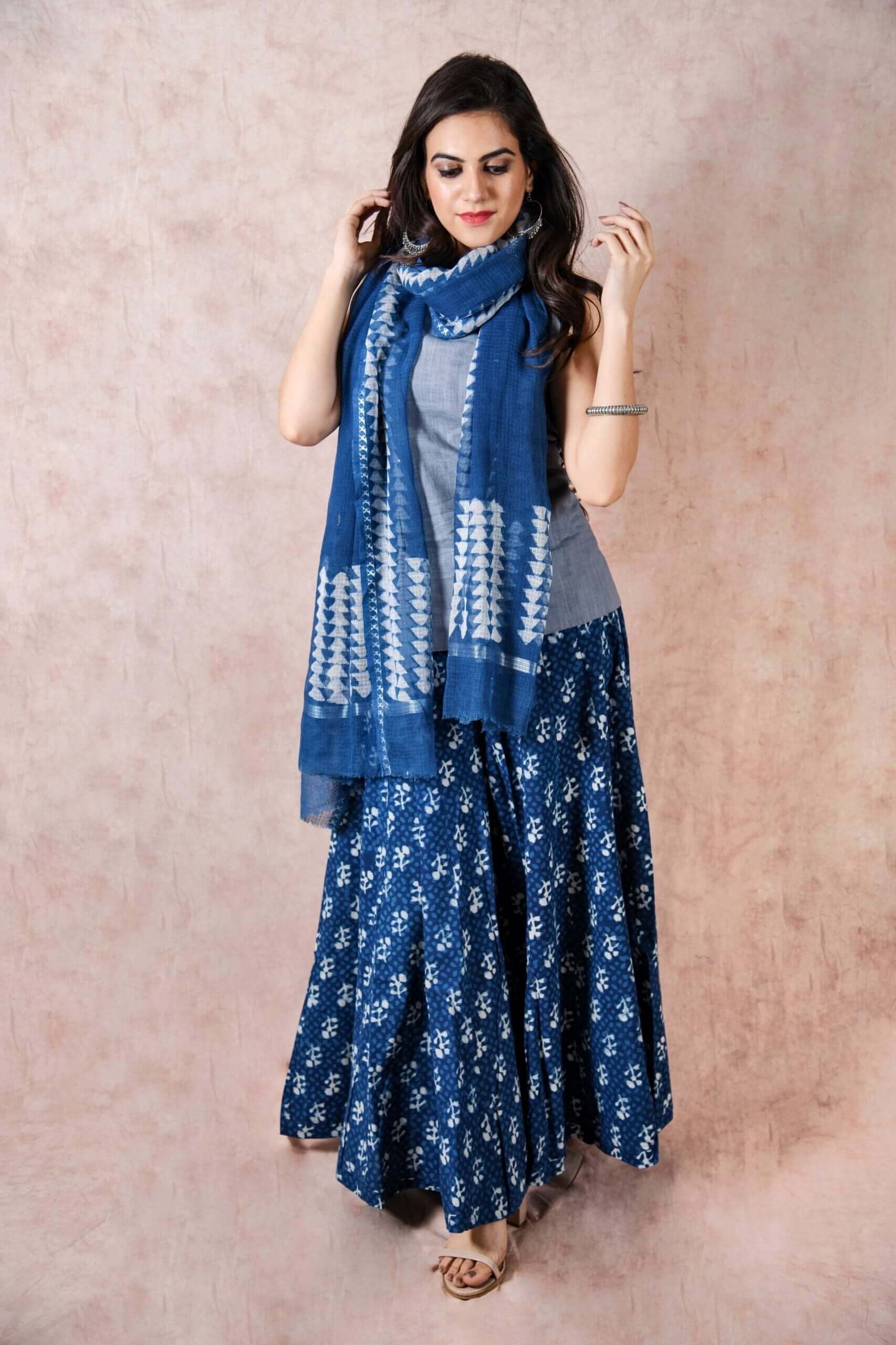 The quintessential indigo colour blooms with a twist in this pretty panel palazzo. The deft design detail throughout the fabric gives this flowy bottom the look and feel of a twirly long skirt.