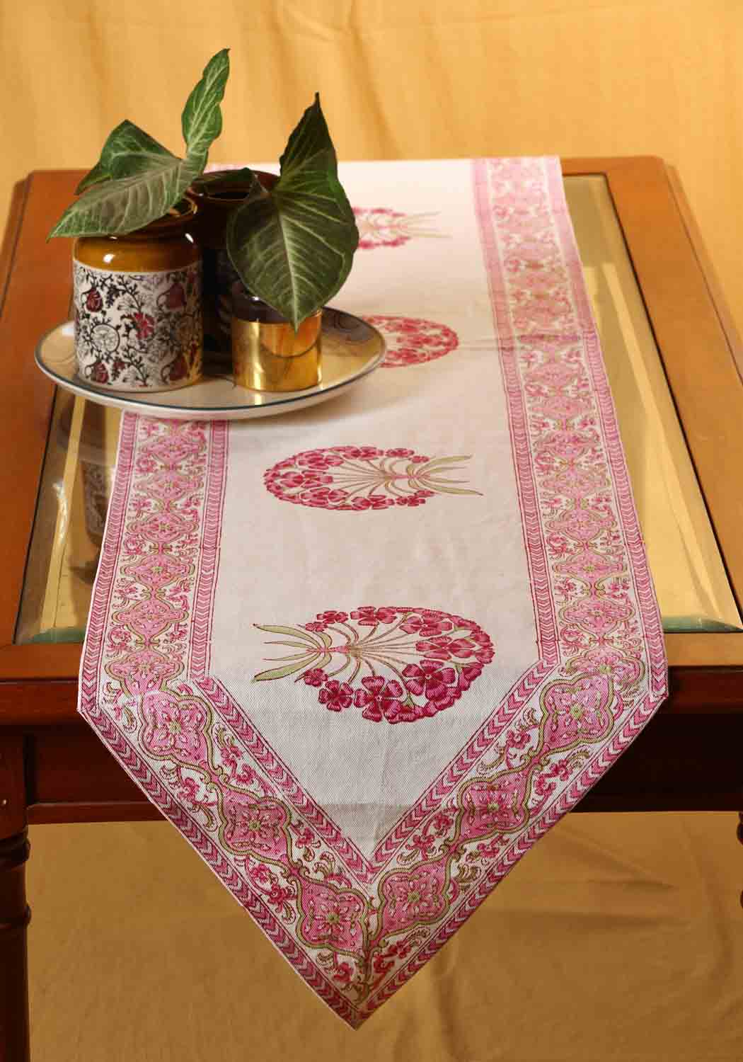 Cushy Florid from Ambiya is a premium Table Runner which lends a sophisticated vibe to your table with its contemporary design on each side. Inviting and stylish, this runner goes easily with any dinnerware, from casual to fancy. The minimal print with a broad border will make your table look delightful.