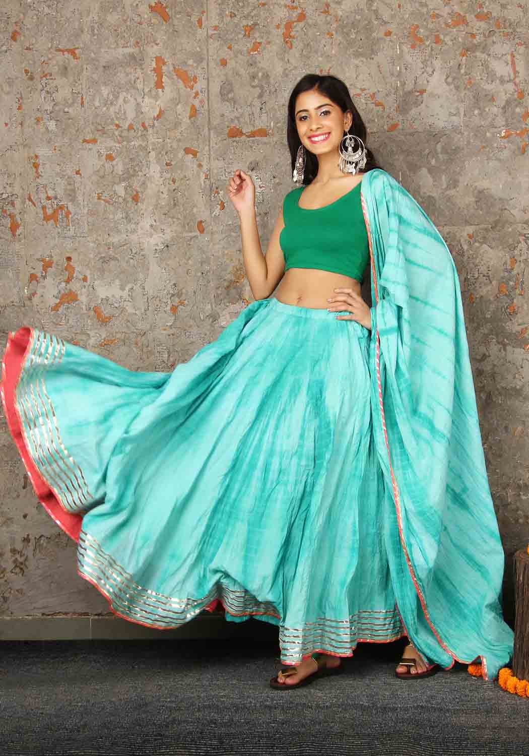 Order Contains: 1 ready dupatta length 2.5mt, fabric for top 2.5mt, stitched full panel circular lehenga.