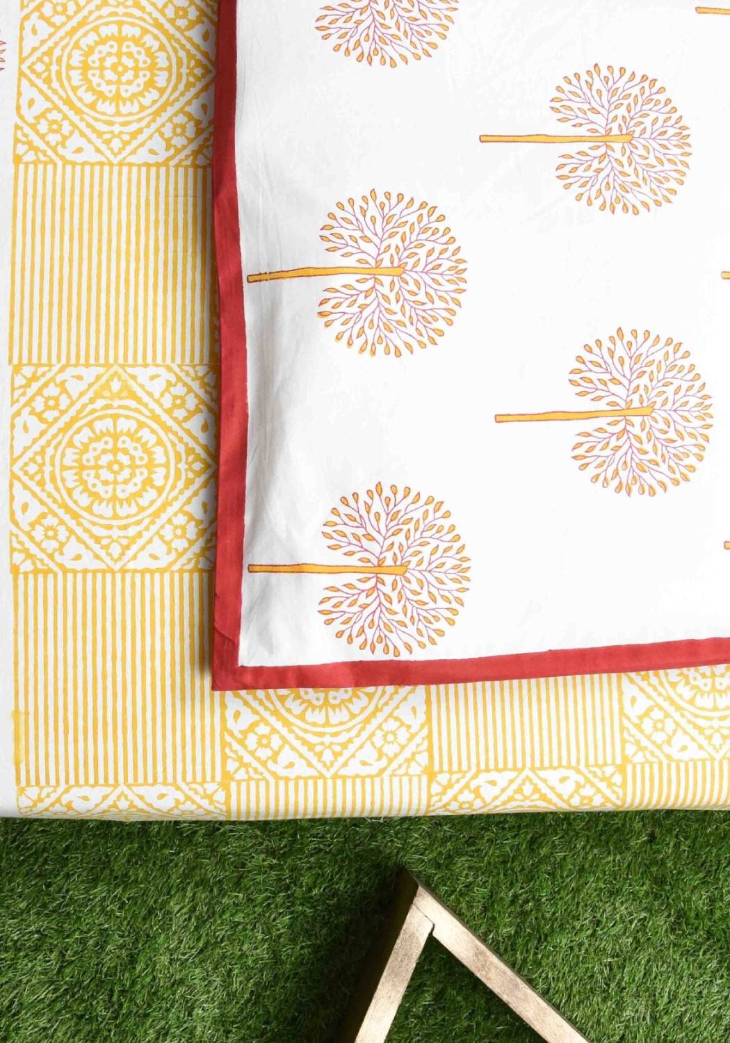 Exhibit the best of nature and art in your bedroom with this dual designed delight from Ambiya. What makes this bed sheet a bestseller is its soft cotton touch and the soothing shades of the day. The contrasting red band, blooming woods and geometric designs tie in tandem while sparking a discourse that’ll delve deep.