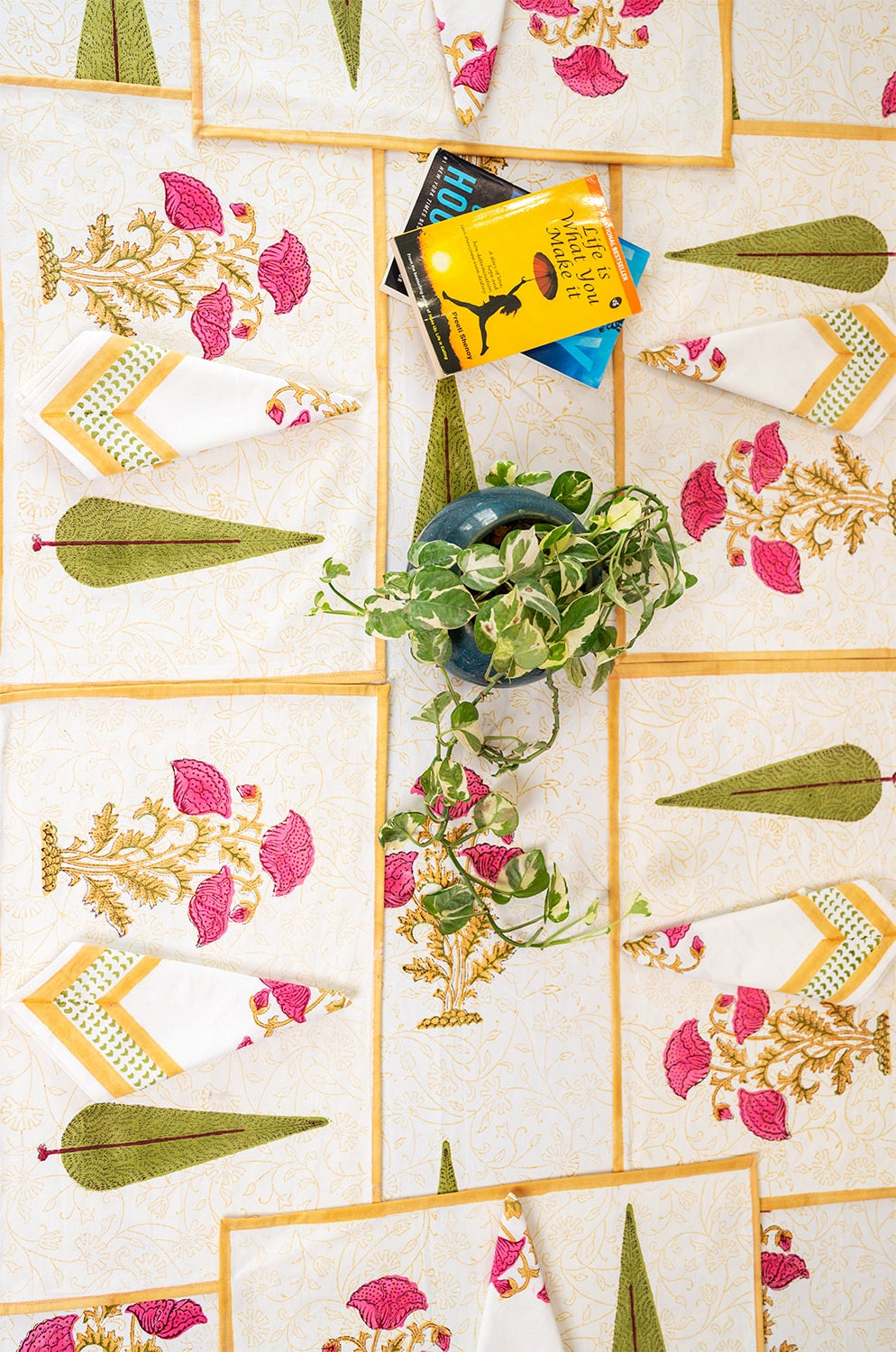 Discover the allure of traditional craftsmanship with the Regal Patterns placemat napkin set. Featuring bold hand block prints in rich, royal hues, this collection exudes grandeur and style. The cotton fabric is soft to the touch and durable, ensuring a beautiful and lasting addition to your home.