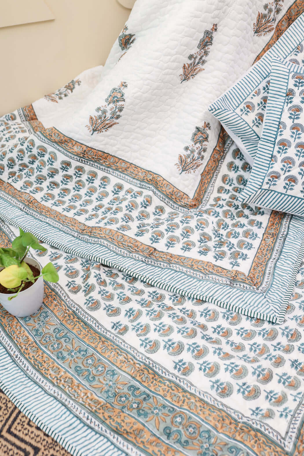 Bring a touch of rustic beauty to your home with the Rustic Charm Ensemble. Hand block prints of earthy tones and traditional patterns create a warm and inviting atmosphere. Crafted from soft, breathable cotton, this comforter combines comfort with a classic aesthetic.