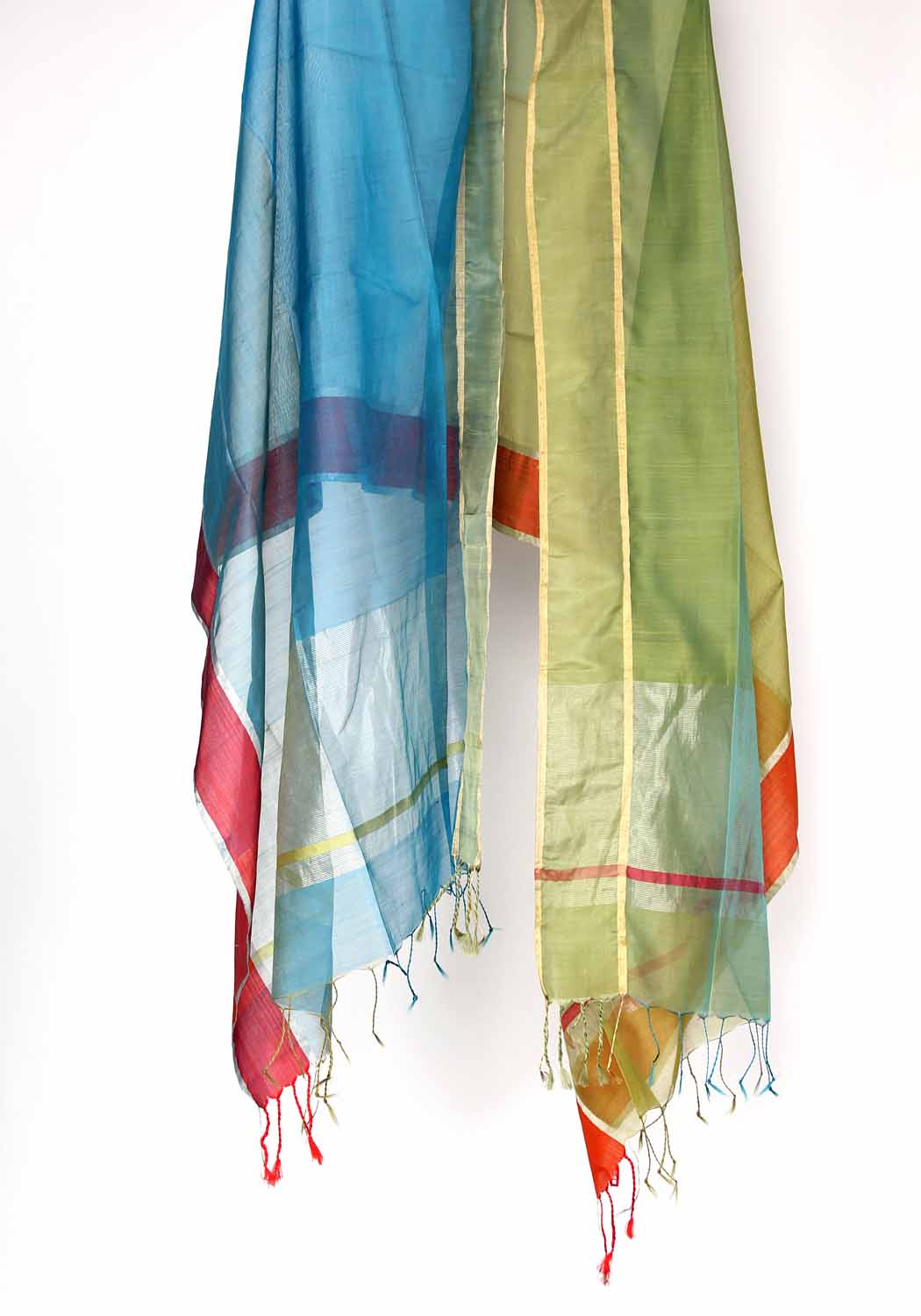 This multi-toned Ambiya exclusive equips you with the liberty to add a myriad of colours and flavours to your wardrobe all at once. Wrap yourself in the harmonious blend of earthy green and sea blue as it forms a welcoming contrast against the fiery red borders and airy silver work to give you a delightful drape.
