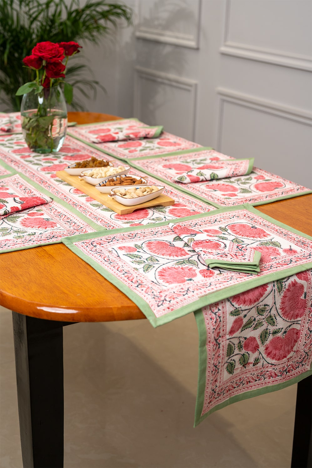 Embrace the gentle beauty of nature with the Whispering Meadows Table runner. Featuring hand block prints of delicate wildflowers and serene landscapes, this collection brings a calming touch to your bedroom. The soft cotton fabric enhances your dining experience with luxurious comfort.