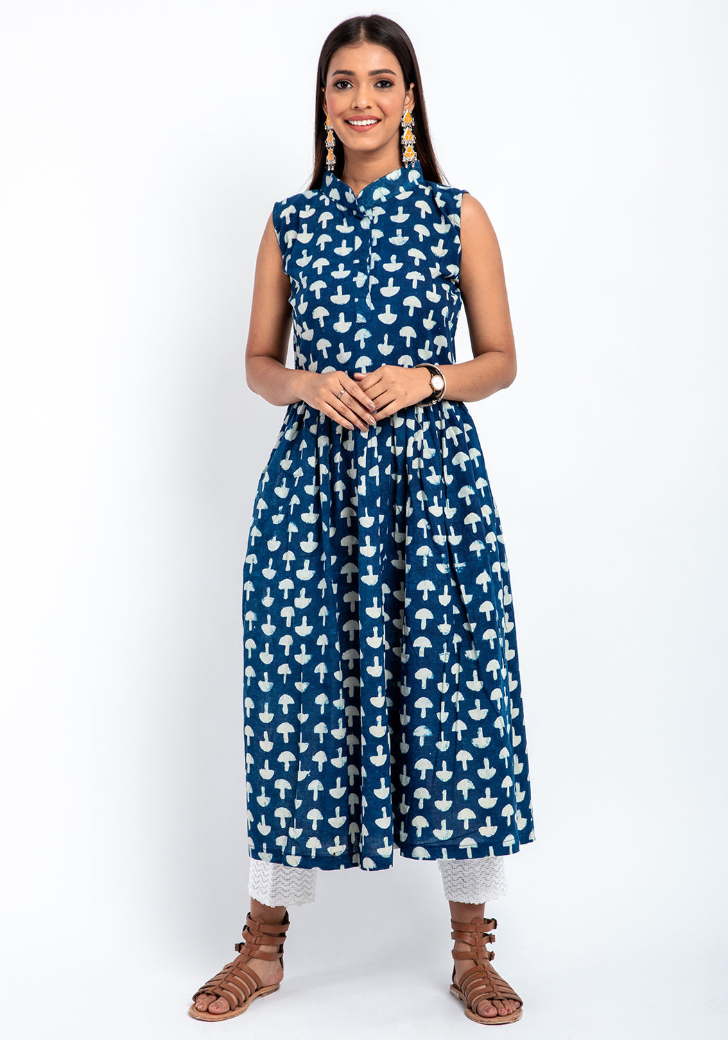 Style: Sleeveless kurta with mandarin collar and gathering at the waist