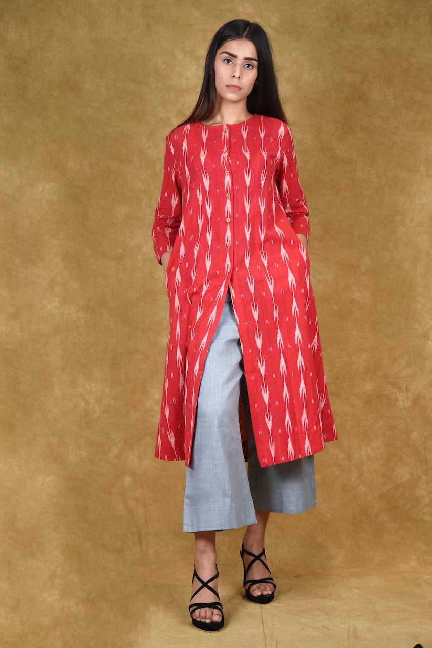 Experience the union of crispness and comfort come alive in this perfect work wear ensemble from Ambiya. This dreamy shrug comes with a vivacious overlay that teams up well with the solid top and bottom set and adds depth to your stance.